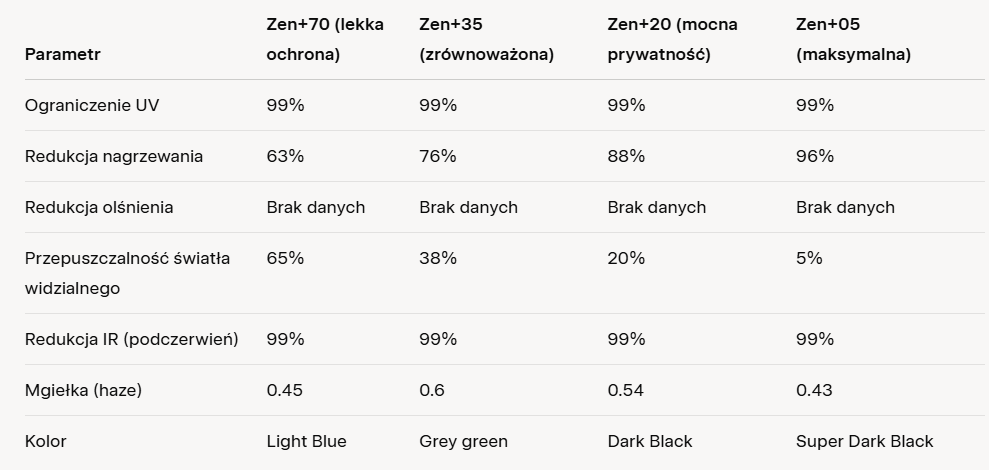 • Estetyka i prywatność: Matowy, nowoczesny wygląd w kolorach od jasnoniebieskiego (Light Blue, VLT 65%) po super ciemny czarny (Super Dark Black, VLT 5%), oferując doskonałą prywatność